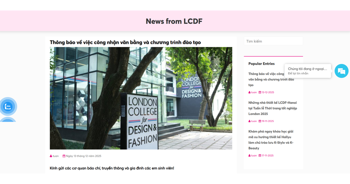 Sáng nay ngày 13.12, Trường Cao đẳng nghề Thiết kế và Thời trang London (Hà Nội), gọi tắt là LCDF, đã chính thức đăng tải thông báo trên trang web của nhà trường về việc xác nhận liên quan đến văn bằng và chương trình đào tạo của trường. Thông báo này xuất hiện trong bối cảnh Bộ Giáo dục và Đào tạo Việt Nam chưa công nhận các văn bằng do trường cấp, đặc biệt là cử nhân do Đại học Liverpool John Moores cấp, cũng như các chương trình liên quan.
