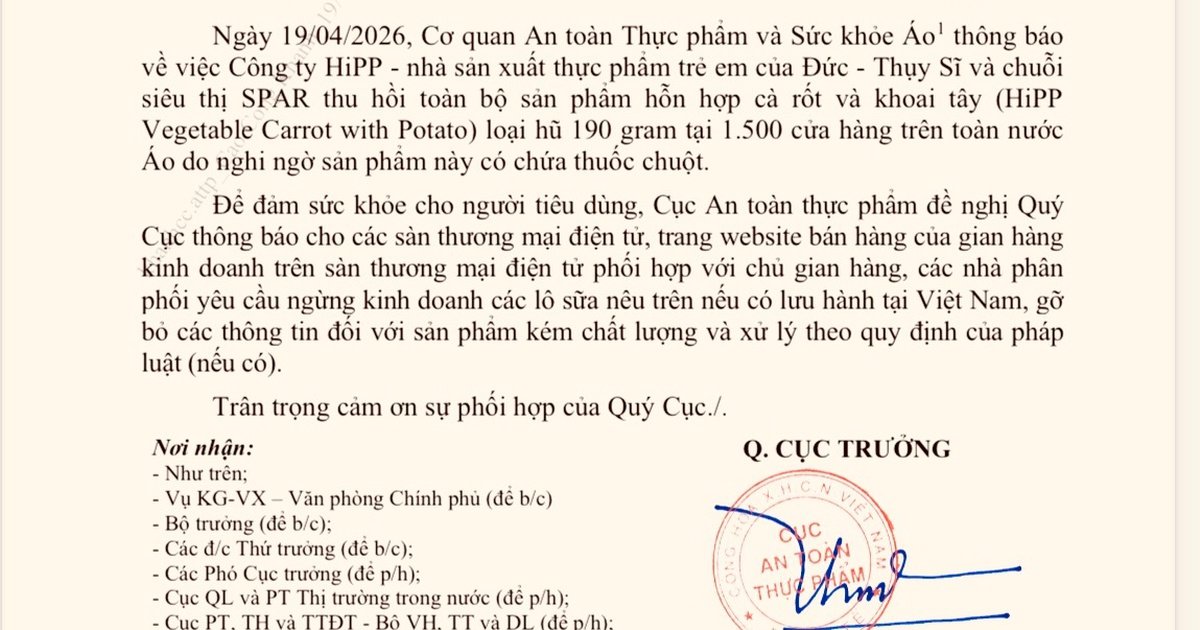 Ngày 19.4.2026, Cục An toàn thực phẩm (Bộ Y tế) đã chính thức gửi công văn yêu cầu các cơ quan chức năng và các đơn vị liên quan thực hiện các biện pháp cấp thiết nhằm kiểm tra và xử lý sản phẩm hỗn hợp cà rốt và khoai tây (HiPP vegetable carrot with potato) loại hũ 190 gram của Đức – Thụy Sĩ, do Công ty HiPP sản xuất, đã được phân phối trên hơn 1.500 cửa hàng tại Áo. Sản phẩm này đang bị nghi ngờ chứa thuốc chuột, gây nguy cơ ảnh hưởng trực tiếp đến sức khỏe người tiêu dùng.