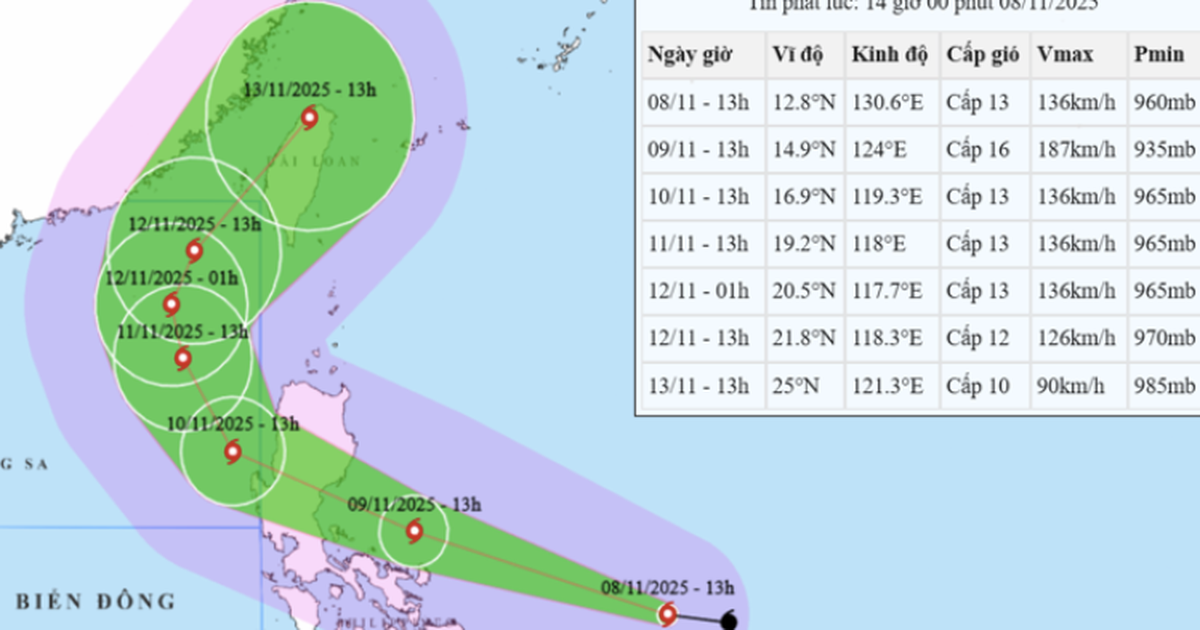 Tuy nhiên, khi đi vào gần vùng biển phía đông nam đảo Luzon (Philippines), bão có khả năng suy yếu do gặp điều kiện môi trường không thuận lợi. Dự báo, khoảng sáng ngày 10.11, bão sẽ di chuyển vào vùng biển phía đông Bắc Biển Đông với cường độ cấp 13, giật cấp 16. Đây sẽ là cơn bão số 14 trong năm nay trên Biển Đông.