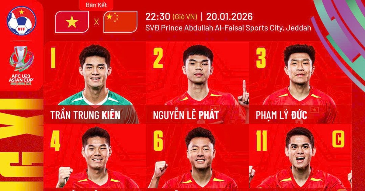 Các chiến binh trẻ của U.23 Việt Nam đã sẵn sàng cho trận bán kết gặp U.23 Trung Quốc diễn ra lúc 22 giờ 30 hôm nay (20.1), trong khuôn khổ giải U.23 châu Á 2026. Dưới sự dẫn dắt của HLV Kim Sang-sik, đội tuyển đã công bố đội hình mạnh nhất nhằm hướng tới một chiến thắng quan trọng.