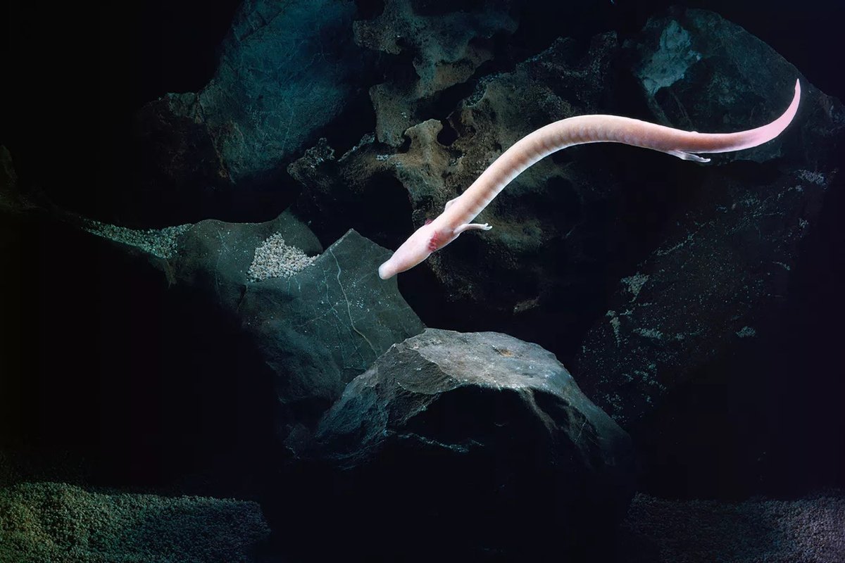 Đầu hình quả lê, mõm dài phẳng, khoang miệng chứa những chiếc răng nhỏ dùng để găm con mồi chứ không nhai. Chúng di chuyển bằng cách uốn lượn cơ thể như lươn, sinh vật này hoàn toàn mù lòa, nhưng lại có hệ thống cảm giác siêu việt. Nhờ các cơ quan cảm biến phát triển mạnh mẽ, chúng nhận biết hóa chất trong nước, rung động và sóng điện từ – trong đó nổi bật là “bóng bầu dục” phát hiện điện trường yếu giúp định hướng dựa trên trường từ trái đất.