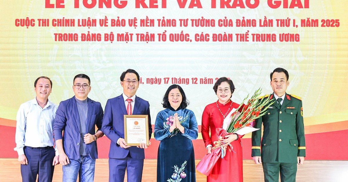 Chiều ngày 17.12, tại Hà Nội, Đảng ủy Mặt trận Tổ quốc Việt Nam phối hợp cùng các đoàn thể trung ương đã tổ chức lễ tổng kết và trao giải cuộc thi chính luận về bảo vệ nền tảng tư tưởng của Đảng lần thứ nhất, năm 2025. Buổi lễ có sự tham dự của bà Bùi Thị Minh Hoài, Ủy viên Bộ Chính trị, Bí thư Trung ương Đảng, Bí thư Đảng ủy MTTQ Việt Nam, cùng các đại biểu từ các đoàn thể và lãnh đạo chủ chốt của ủy ban.