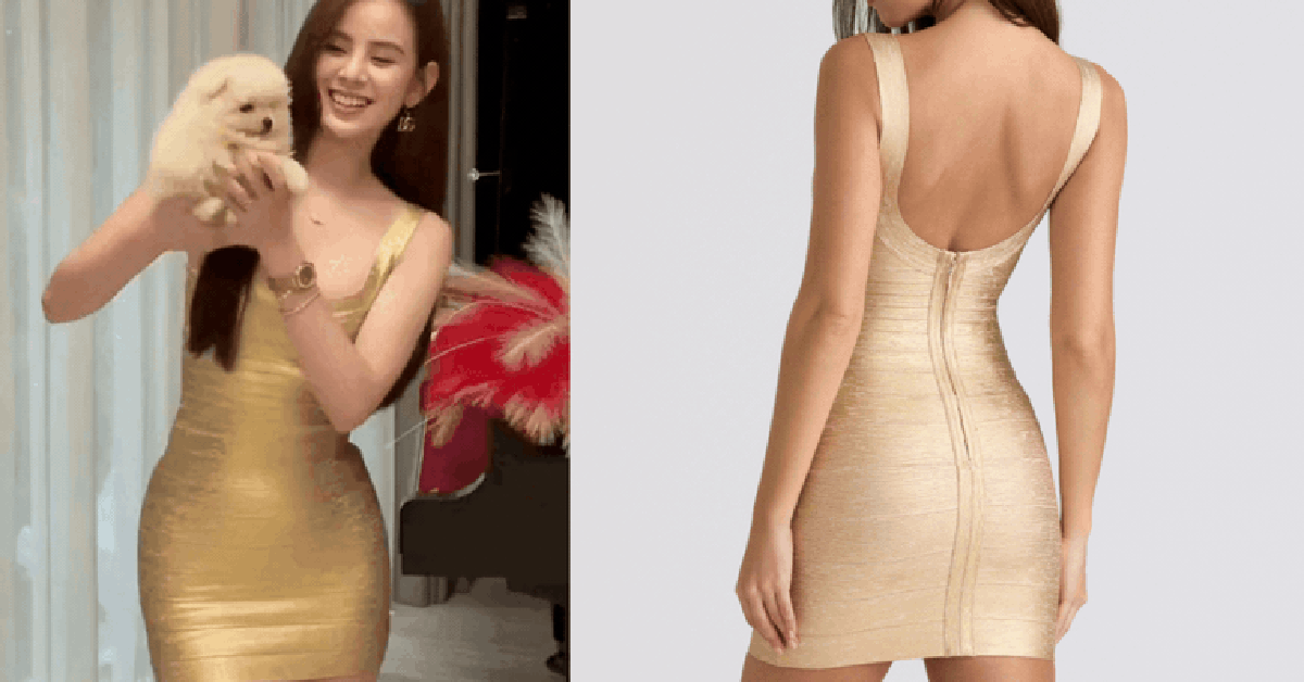 Chiếc váy mà Hương Liên lựa chọn là mẫu Gold Bandage Mini Dress đến từ thương hiệu House of CB, có giá khoảng 5,2 triệu đồng (khoảng 149 bảng Anh). Vẻ đẹp của mẫu thiết kế này nằm ở phom dáng ôm sát, chất liệu bandage giúp tôn lên đường cong cơ thể một cách hoàn hảo. Thiết kế hai bản to kết hợp cổ tròn vừa gợi cảm vừa tinh tế, tông màu vàng ánh kim mang đến vẻ sang trọng, bắt mắt. Với vóc dáng mảnh mai cùng chiều cao nổi bật, Hương Liên diện chiếc váy này càng làm nổi bật thần thái quyến rũ, thần thái cuốn hút của cô.