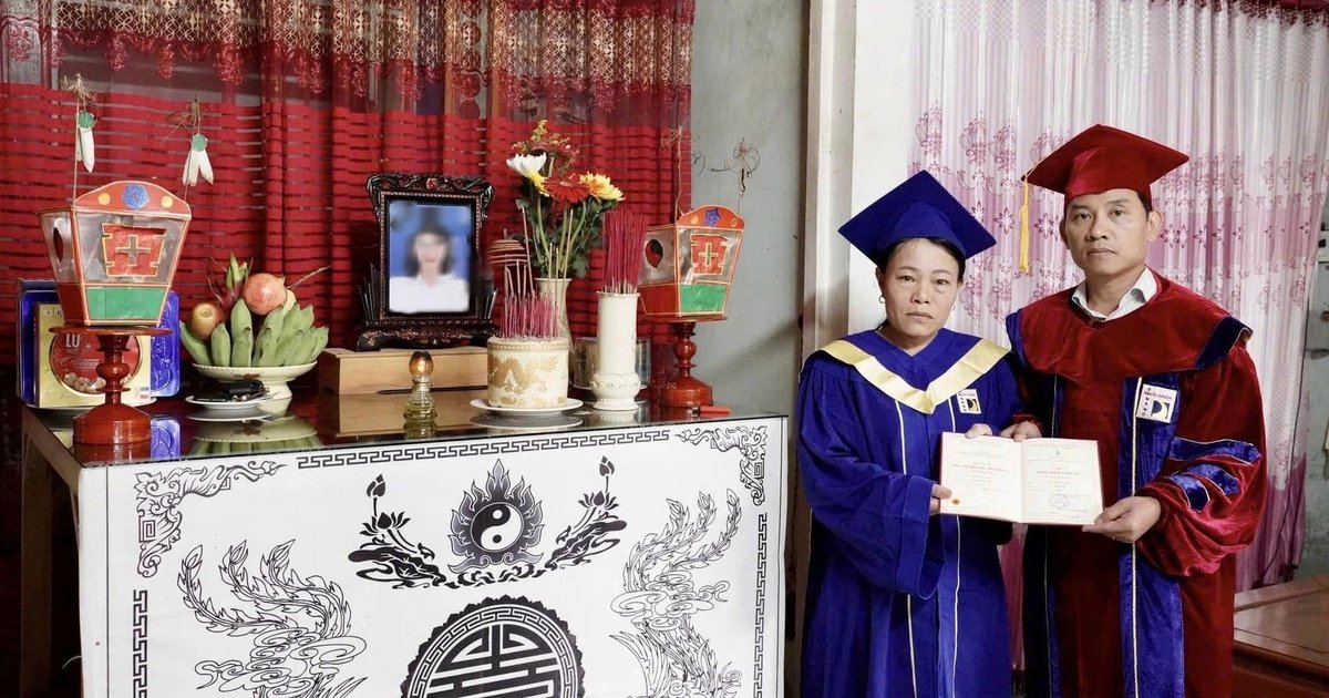 Trong gian nhà lặng lẽ, mẹ của Trà run rẫy khi khoác lên trên vai chiếc áo cử nhân thay con, ánh mắt đỏ hoe vì xúc động. Người cha đứng lặng lẽ bên bàn thờ, hướng về hình ảnh người con gái đầu lòng mà họ thương yêu vô hạn, dù đã không thể dự lễ tốt nghiệp cùng các bạn bè của cô.