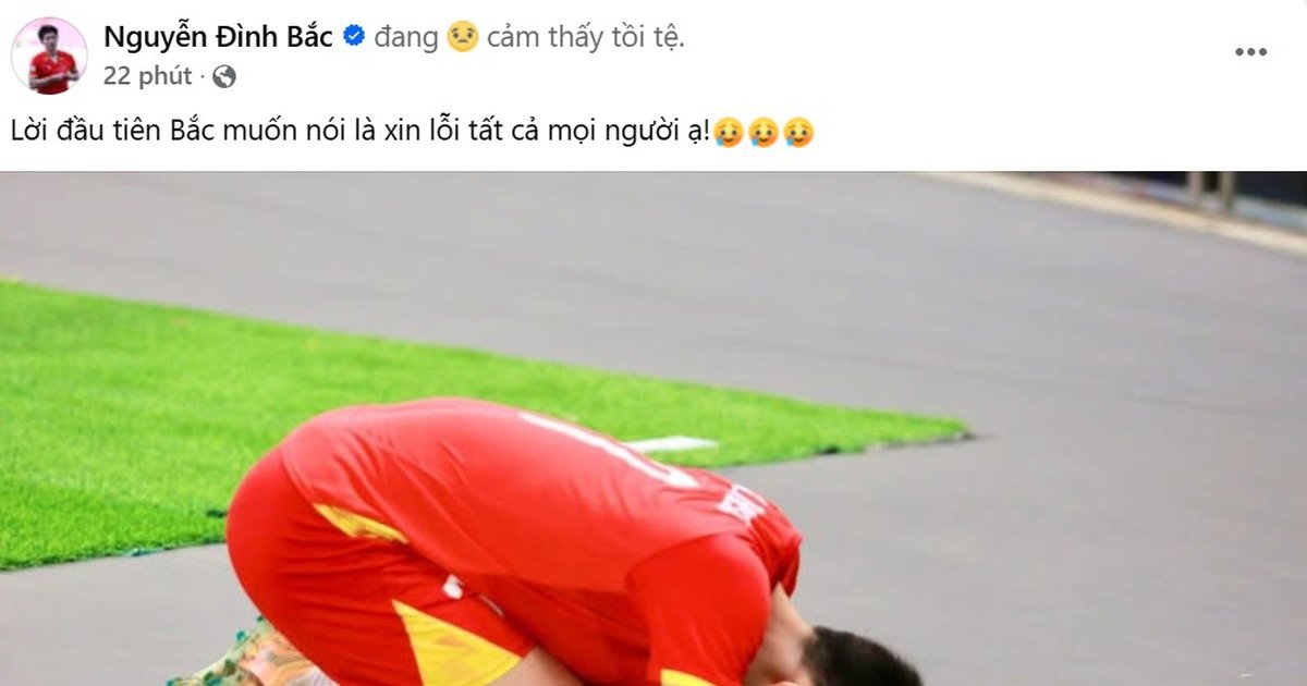 Sau trận thua nặng nề trước U.23 Trung Quốc tại bán kết VCK U.23 châu Á 2026, cầu thủ Nguyễn Đình Bắc đã gây xúc động mạnh khi đăng tải bài viết xin lỗi người hâm mộ trên trang Facebook cá nhân. Trong bài đăng ngắn gọn, Đình Bắc chia sẻ: “Lời đầu tiên Bắc muốn nói là xin lỗi tất cả mọi người ạ!”, kèm hình ảnh anh quỳ gối, cúi sát người xuống mặt sân, như thể gửi gắm tất cả sự tiếc nuối và trách nhiệm.